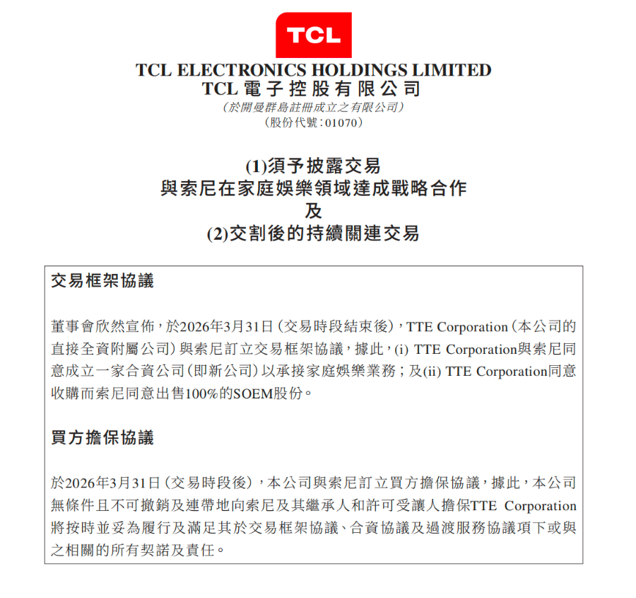 3月31日电,TCL电子公告称,其全资子公司TTE Corporation已与索尼达成交易框架协议,双方将围绕索尼家庭娱乐业务展开战略合作。