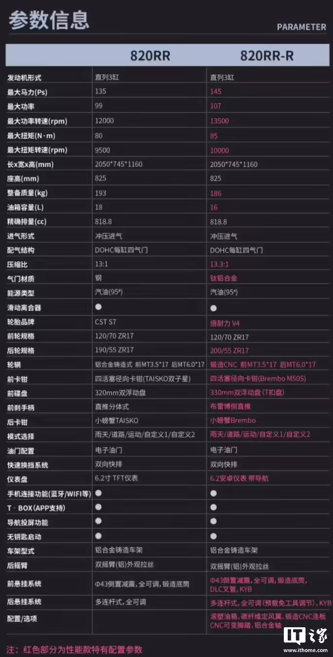 IT之家查询获悉,820RR 车型售价 4.38 万元起,最大马力可达 135PS,零百加速仅 2.81 秒。