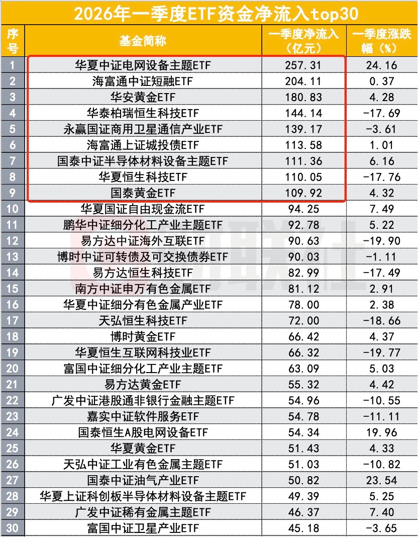 电网设备ETF、黄金ETF、恒生科技ETF获得最多资金流入