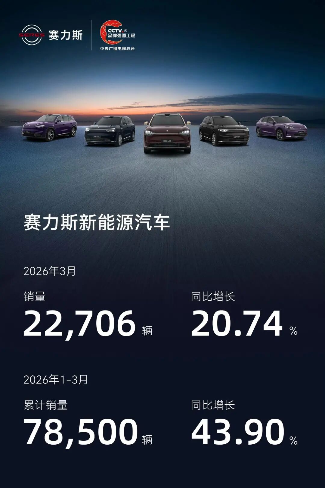 4月1日,赛力斯发布3月产销快报。数据显示,赛力斯新能源汽车3月销量22706辆,同比增长20.74%;1—3月累计销量达78500辆,同比增长43.9%。2026年以来,赛力斯和华为合作的问界系列加速新品迭代,3月23日问界M6开启预订,24小时订单突破6万辆。