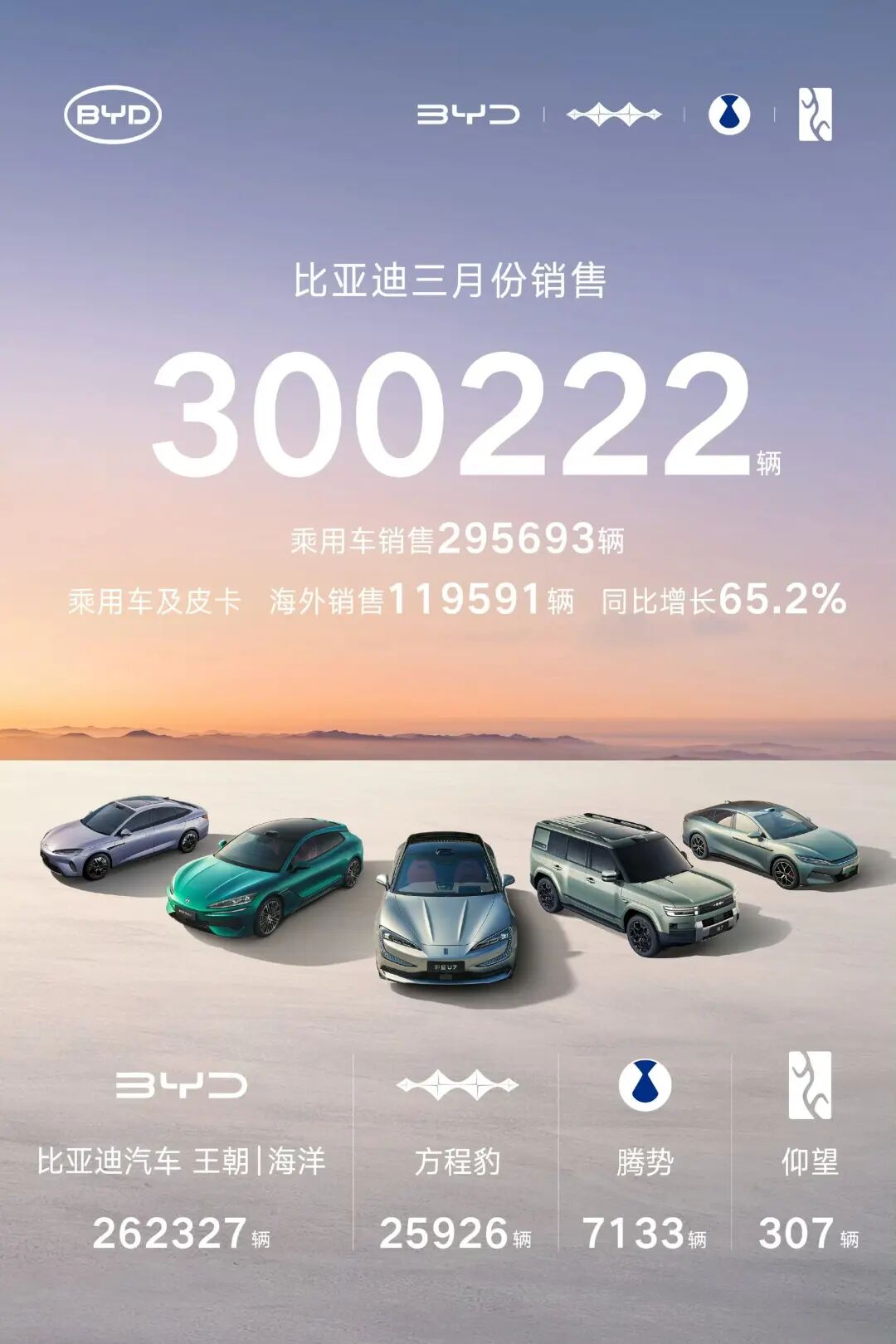 4月1日晚,比亚迪发布的3月销量海报,包括旗下王朝、海洋、仰望等品牌系列数据