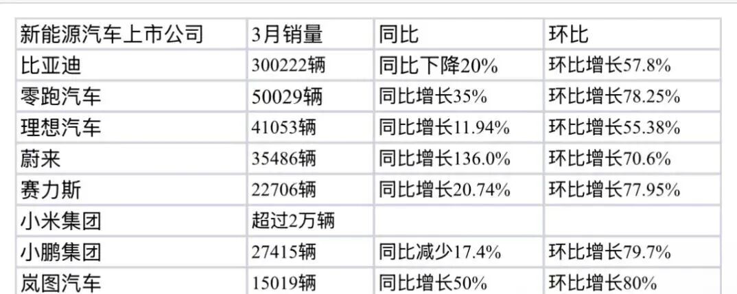 4月1日,中国主要新能源汽车上市公司发布3月新车销量数据