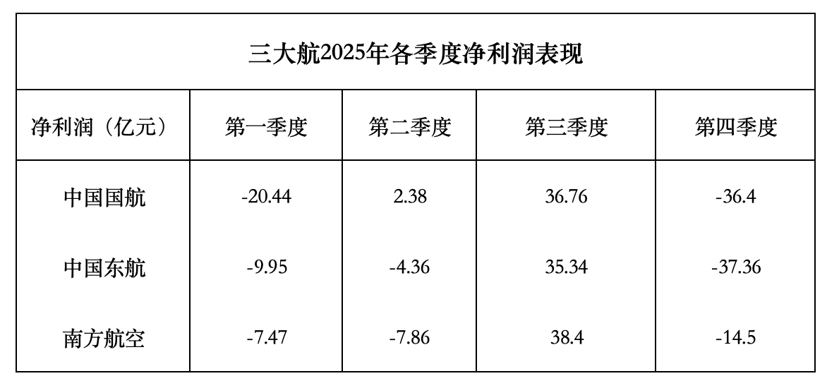 不论是率先扭亏的南方航空还是继续录得亏损的中国国航,第四季度传统淡季均对其业绩形成拖累。第四季度,中国国航净亏损36.4亿元,南方航空净亏损14.5亿元。这一季节性特征在历年财报中均有体现,2025年亦不例外。
