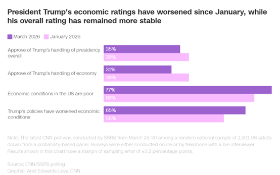 在特朗普计划于周三晚间就伊朗问题发表全国讲话之前,美国有线电视新闻网(CNN)公布了这项由知名调查机构SSRS进行的调查,突显了美国民众正日益感受到美伊战争带来的经济痛苦。