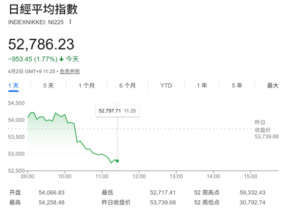 亚太股市由涨转跌,日韩股市领跌。日经225指数开盘上涨0.61%,截至发稿,跌幅为1.77%,报52786.23点。韩国综合指数高开1.3%,截至发稿,下跌3.62%,报5280.39点。