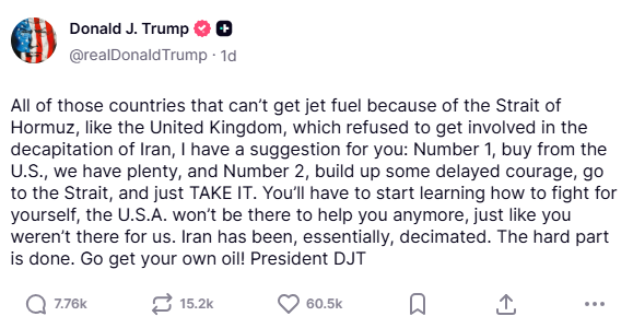 这一言论令市场和专业人士感到既荒谬又混乱,似乎预示着美国在伊朗冲突中被拉入泥沼。而特朗普所谓的美国能源充足,可以为其他国家供应航空燃油的说法也站不住脚,分析师们纷纷指出,美国并没有能力弥补全球的燃油缺口。