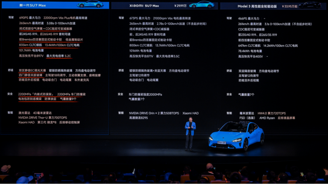 对于能耗上的差距,小米并没有回避。在新一代SU7的发布会上,小米在产品介绍的PPT里特意强调,Model 3后驱版和长续航后驱版的CLTC电耗表现,分别优于新一代SU7标准版和Pro。但新一代SU7 Max的CLTC电耗为13.4kWh/100km,优于Model 3高性能四驱版。