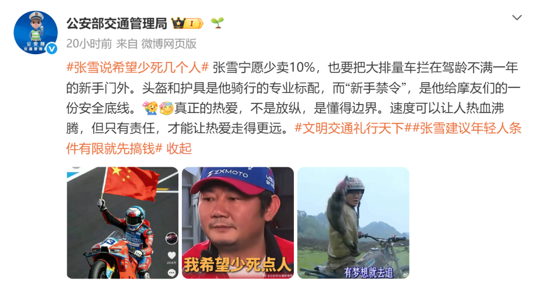 4月1日,@公安部交通管理局 就“张雪机车‘新手禁令’”发文称,这是他给摩友们的一份安全底线。速度可以让人热血沸腾,但只有责任,才能让热爱走得更远。