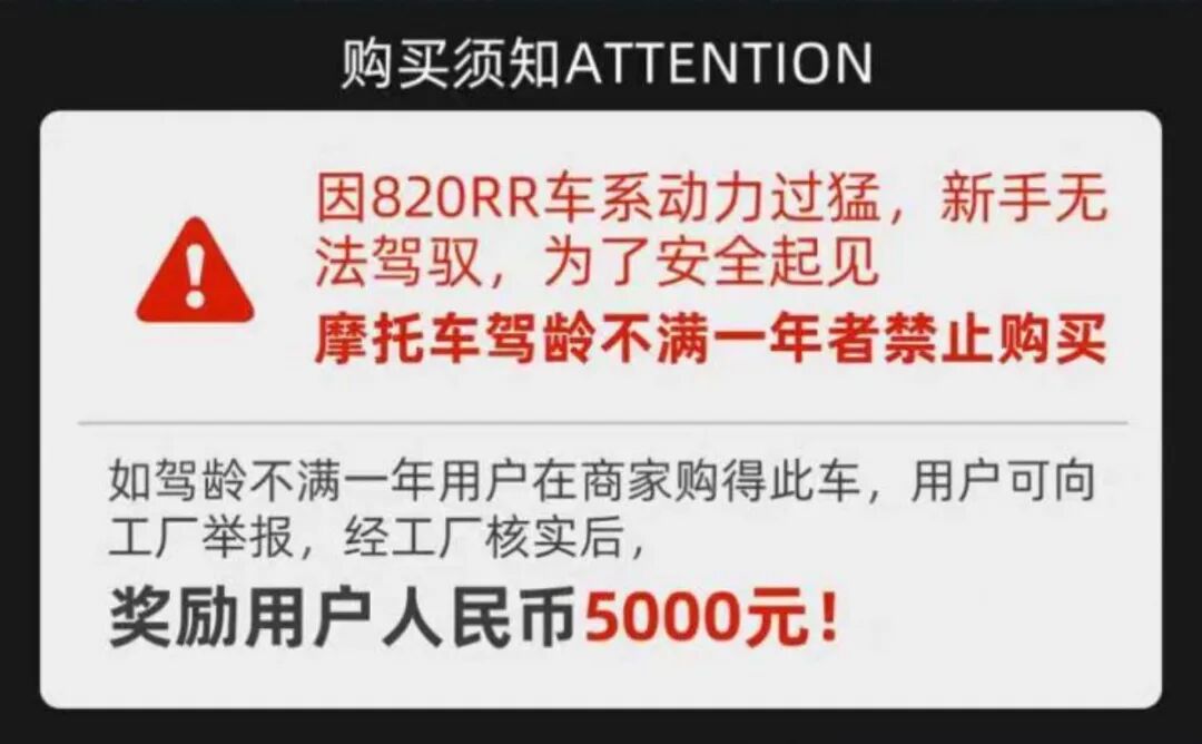 记者在张雪机车仿赛车型820RR对外预定的海报上看到:因820RR车系动力过猛,新手无法驾驭,为了安全起见,摩托车驾龄不满一年者禁止购买该车。如驾龄不满一年用户在商家购得此车,用户可向工厂举报,经工厂核实后,奖励用户5000元。