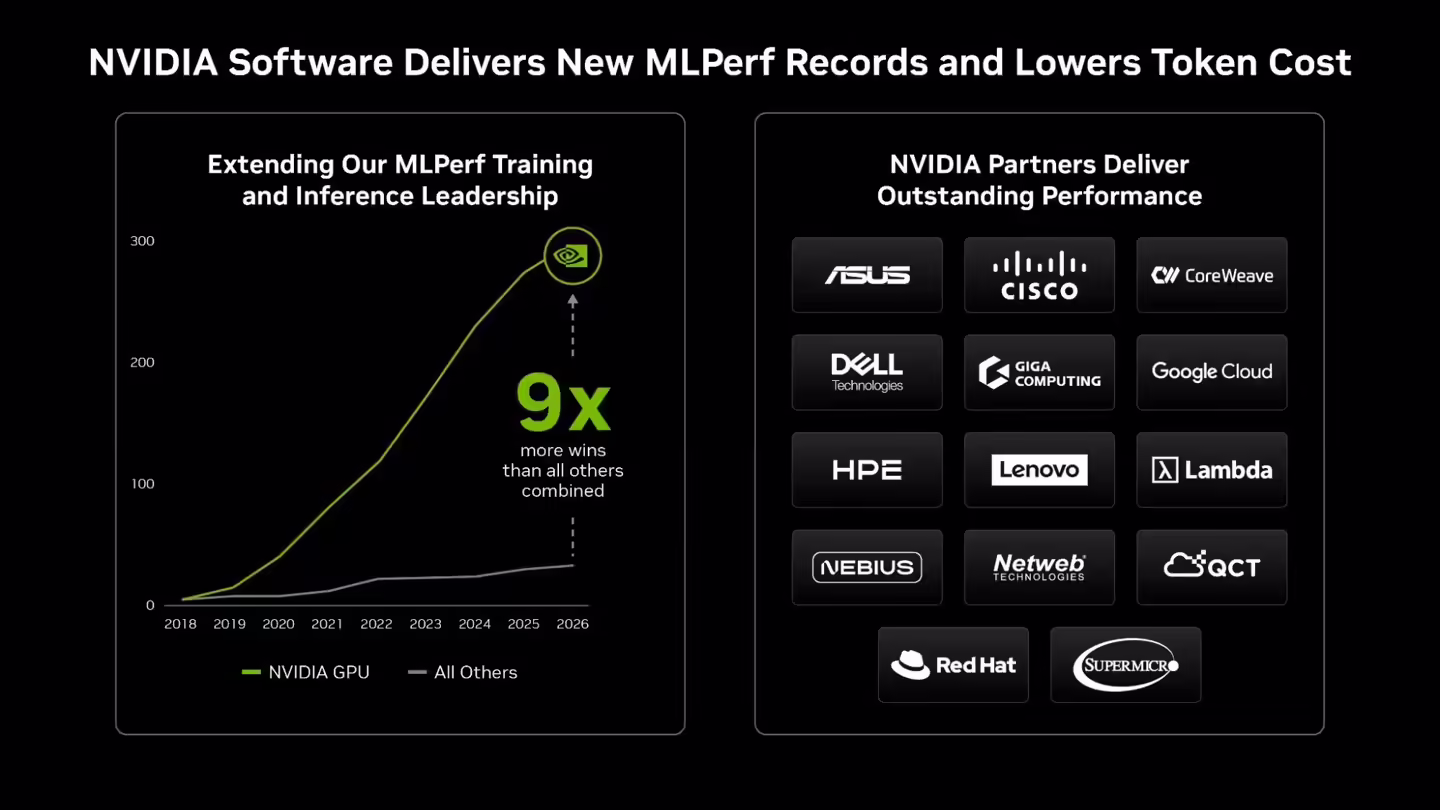 官方最新公布的 MLPerf 推理 v6.0 测试结果显示,英伟达凭借 Blackwell Ultra 架构(GB300 NVL72),实现了全方位的性能碾压,其 AI 推理成绩不仅位列第一,其推理训练 Wins 数量更领先最接近的竞争对手 9 倍。