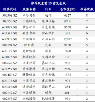 中国海油(600938)、比亚迪(002594)等,合计均被推荐了5次;兖矿能源(600188)、招商轮船(601872)、卫星化学(002648)、药明康德(603259)等,均被推荐了4次。