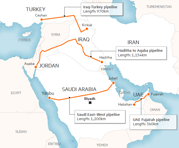 该管道建于20世纪80年代,当时由于担心伊朗与伊拉克的战争会封锁海峡而兴建。而现在,它已成为了沙特石油出口的一条关键生命线——该国目前每天能通过该管道向红海港口延布输送700万桶石油,完全绕过霍尔木兹海峡。