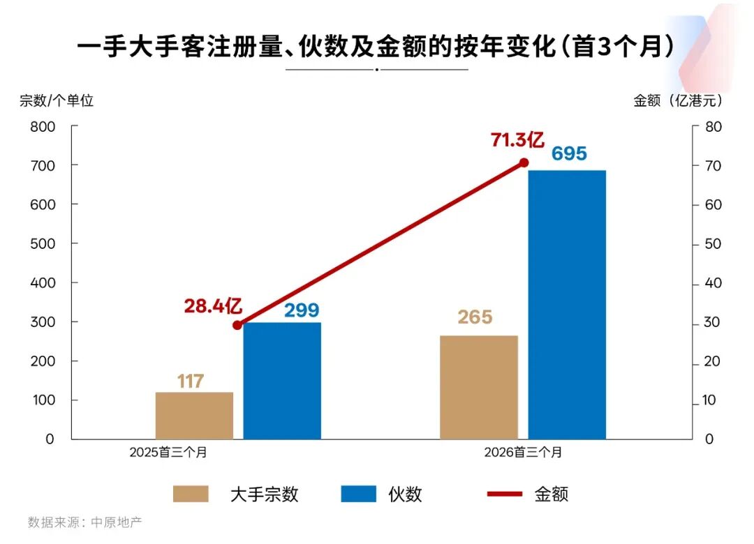 香港中原地产最新数据显示,截至3月20日,2026年一季度香港新房市场共记录265宗“大手客”入市案例(指同一买家在同一小区购入多套房源),创下2008年以来同期新高。
