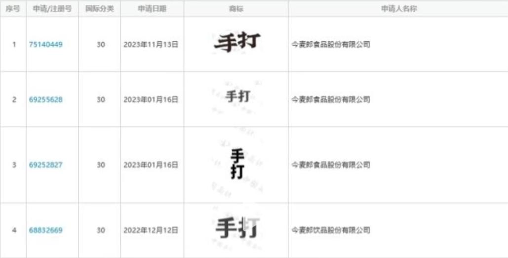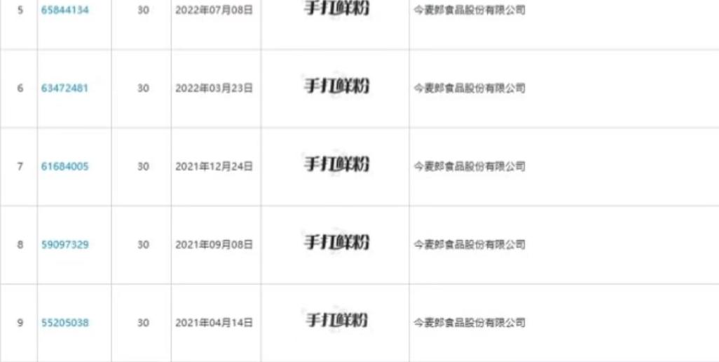 记者在国家知识产权局商标局搜索发现,今麦郎注册了多个不同样式的手打商标。并且还有“手打师傅”“手打鲜粉”“手打面”等商标。