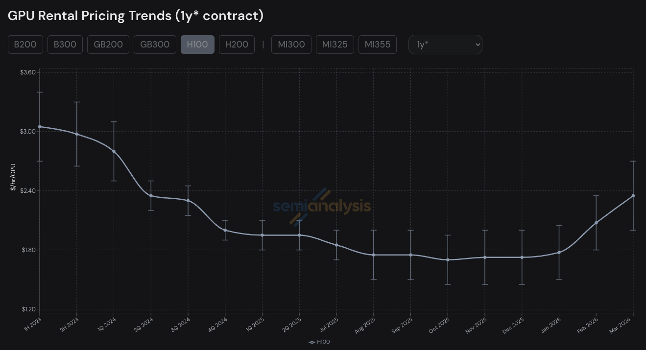 据半导体研究机构SemiAnalysis周四推出的“H100一年期租赁合约价格指数”,这款“老芯片”的租赁合约价格从2025年10月触及每小时1.7美元后,已经在今年3月飙升至每小时每块GPU 2.35美元,飙升近40%