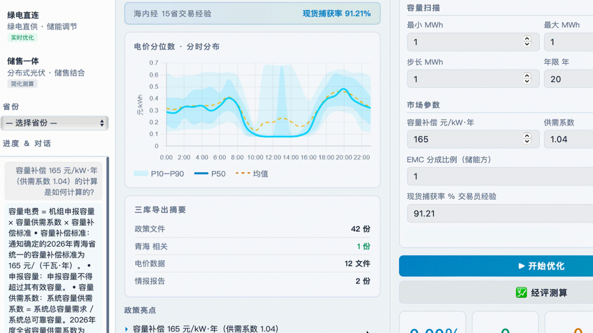 作为“元储·海内经”重要组成部分,它将专注于储能项目的投前测算与决策支持。依托融和元储超24省份运营经验、属地化开发团队与建模能力等领先优势,智能投顾系统以"三库一模型"为核心架构,通过政策数据库、电价数据库与私有知识库的协同,构建全链可追溯、可调用的数据体系;同时,通过全场景仿真模拟定容优化模型,快速实现从政策匹配到收益测算的一体化输出。