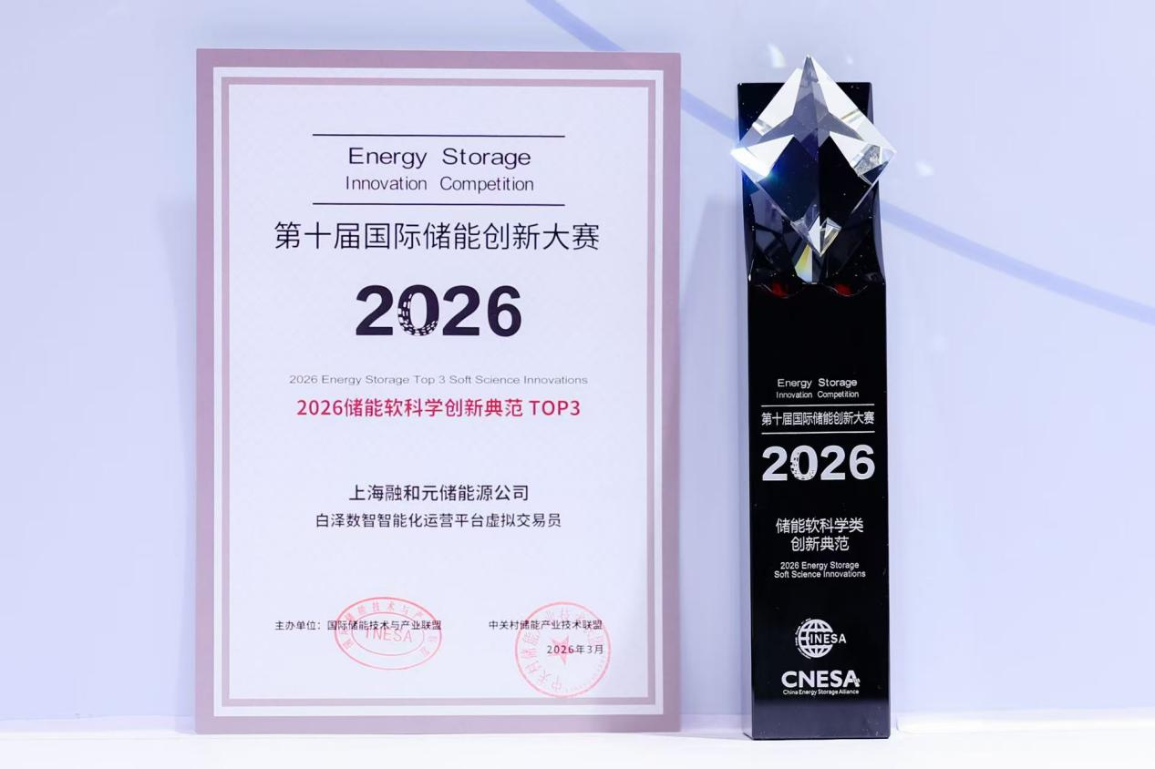 值得一提的是,依托“元储·海内经”,融和元储“白泽数智智能化运营平台虚拟交易员”在本次展会期间,一举斩获第十届国际储能创新大赛“2026储能软科学类创新典范”大奖。
