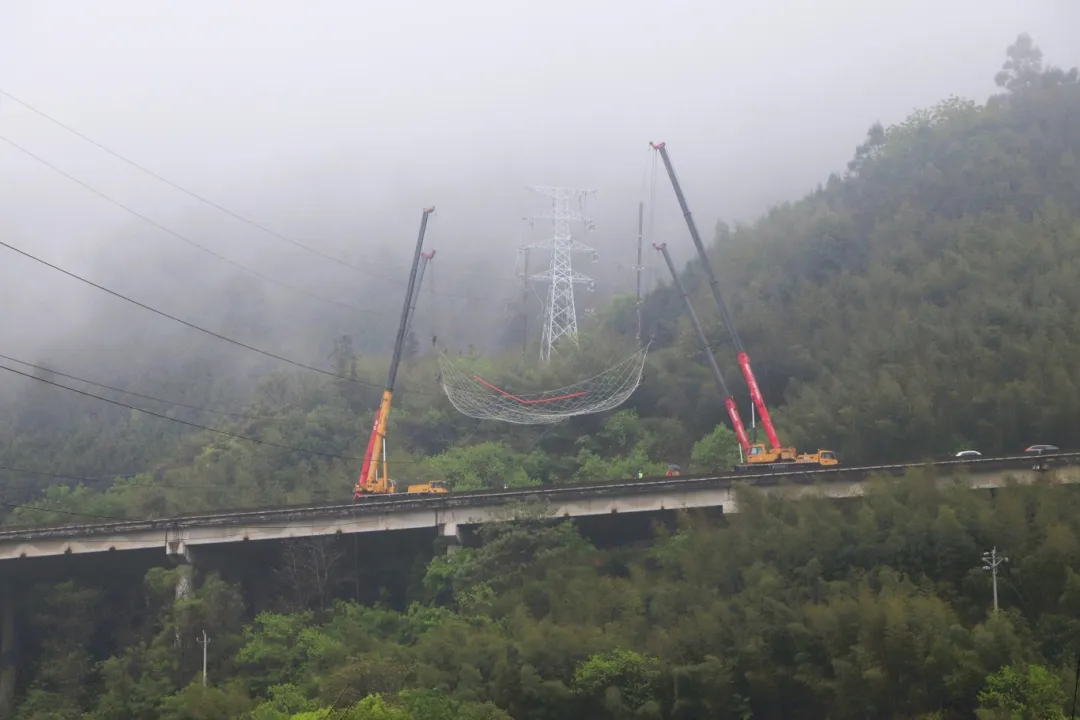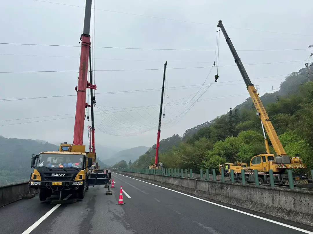 “在通车高速上空施工,精细程度像是在做‘心脏手术’。”项目经理钟健的比喻,道出了此次施工的核心难点。考虑到面对工程路径跨越林地与高速公路的复杂工况,施工团队创新采用“吊车封网”方案。通过两侧吊车同步吊装作业,将特种编织网与承重钢丝绳精密编织成一张坚固的“空中防护网”;同时,沿线搭建7座跨越架进行稳固支撑,共跨越9条10千伏电力线路,并使用无人机对跨越架间区域实施精准封网,有效杜绝导线断裂或下垂触碰下方线路及农田作物的风险。这一系列举措在确保公共安全的同时,同步实现全程不封路、车流通行“零干扰”,并最大程度守护了当地生态环境。本次工程中无人机技术的深度应用成果,正是公司推进数字化转型升级战略的生动实践。