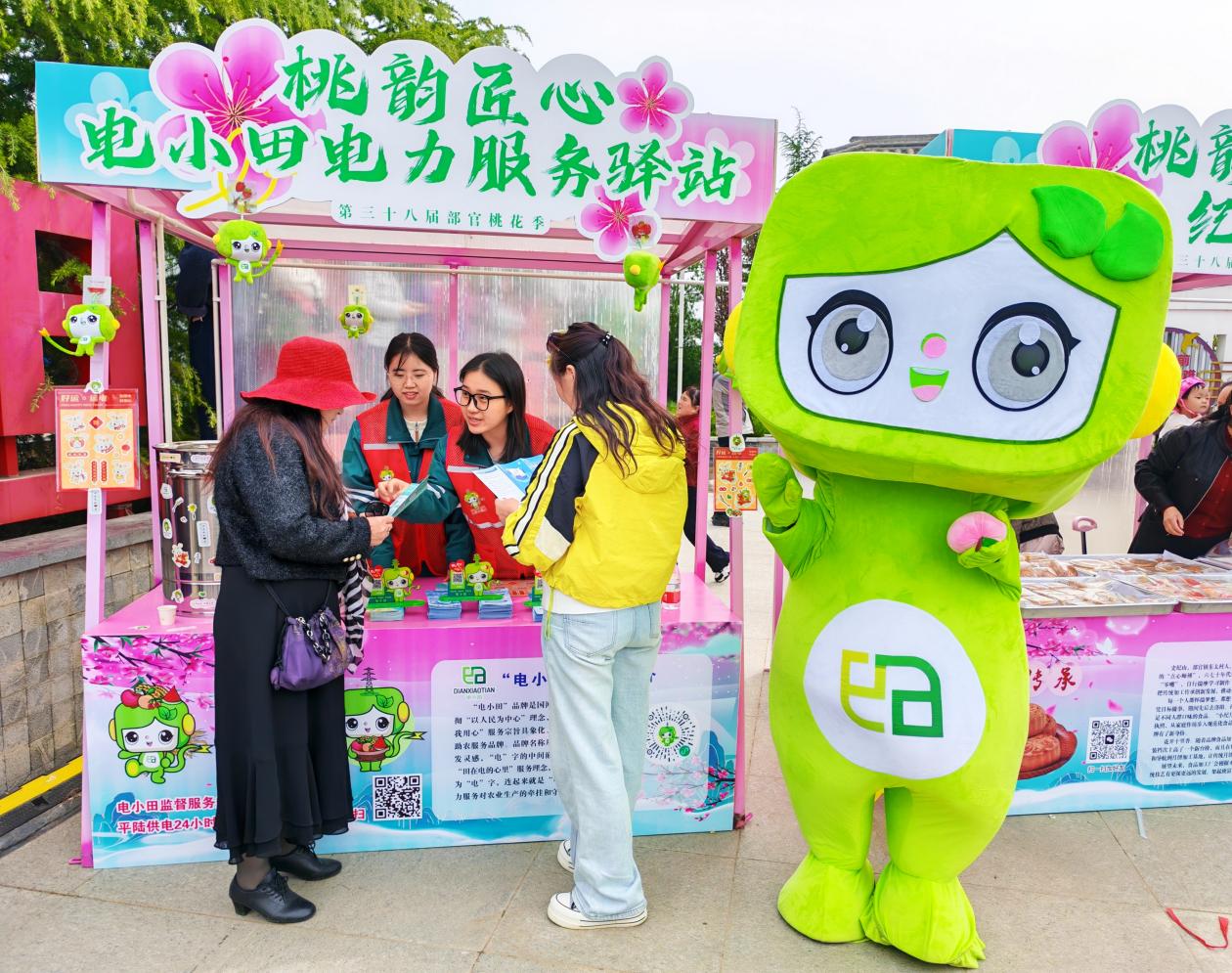 在活动现场,国网运城供电公司还设立了“桃韵匠心 电小田电力服务驿站”,党员服务队队员们身着红马甲,一边为商户和游客讲解扫码用电设备的操作方法,一边宣传安全用电、节约用电知识,推广“网上国网”APP,提供用电咨询、故障报修等一站式服务。可爱的“电小田”IP人偶穿梭在花海与市集之间,向游客发放安全用电宣传册,成为桃花节上一道亮眼的风景线。“从设备安装到现场服务,供电公司全程跟进,有问题随叫随到,让我们经营起来特别安心。”一位农特产品展销商说道。