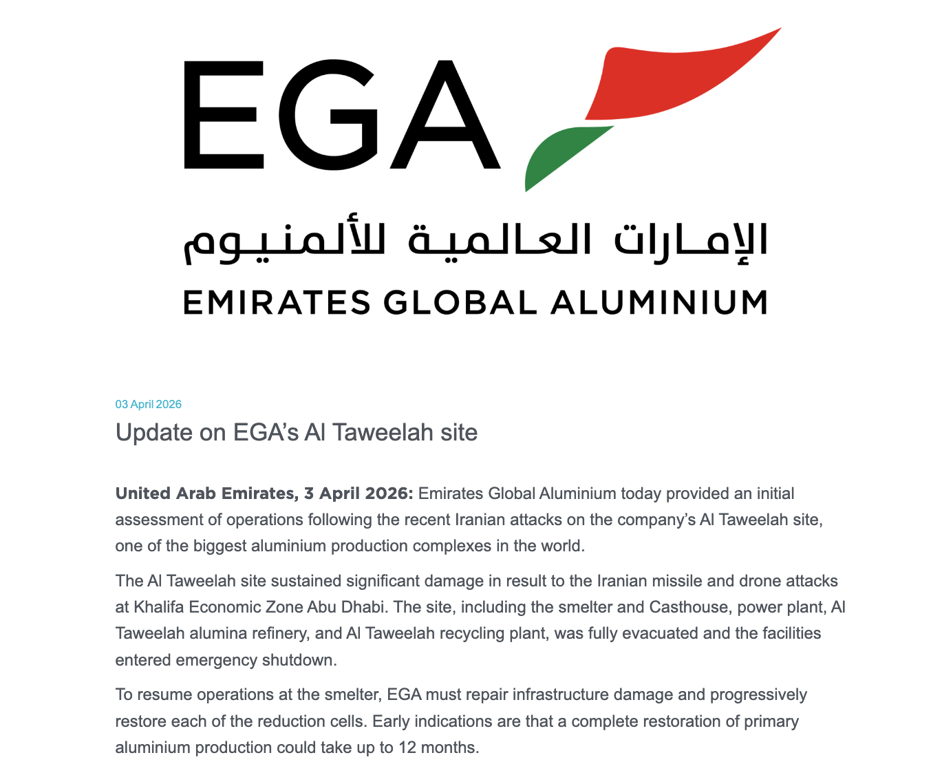 位于阿布扎比郊区塔维拉生产基地是全球最大铝厂之一,2025年生产了160万吨铸锭。该生产基地除了电解铝厂和铸造厂外,还有发电厂、氧化铝精炼厂以及回收厂。公司表示,目前已经撤离所有人员并进入紧急停产状态。