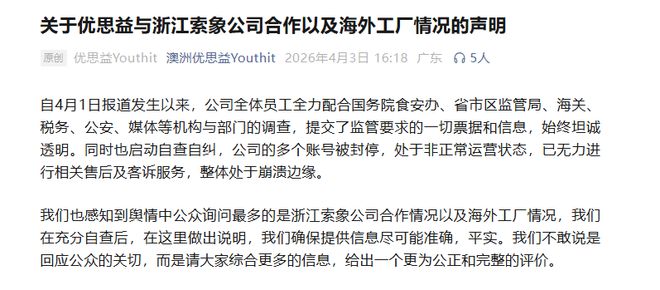 澳洲优思益在声明中称,自被报道后,公司全体员工全力配合国务院食安办、省市区监管局、海关、税务、公安、媒体等机构与部门的调查,提交了监管要求的一切票据和信息,始终坦诚透明。同时也启动自查自纠,公司的多个账号被封停,处于非正常运营状态,已无力进行相关售后及客诉服务。