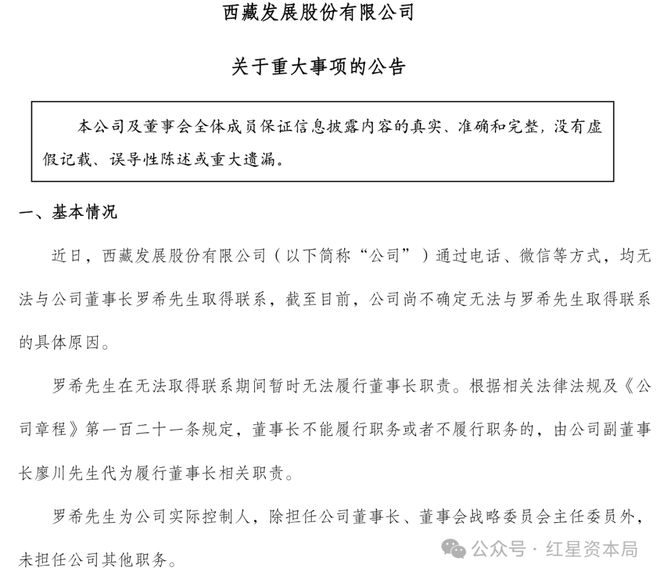 红星资本局4月3日消息,4月2日晚间,ST西发(000752.SZ)发布公告,近日公司无法与董事长罗希取得联系,导致其暂时无法履行董事长职责。