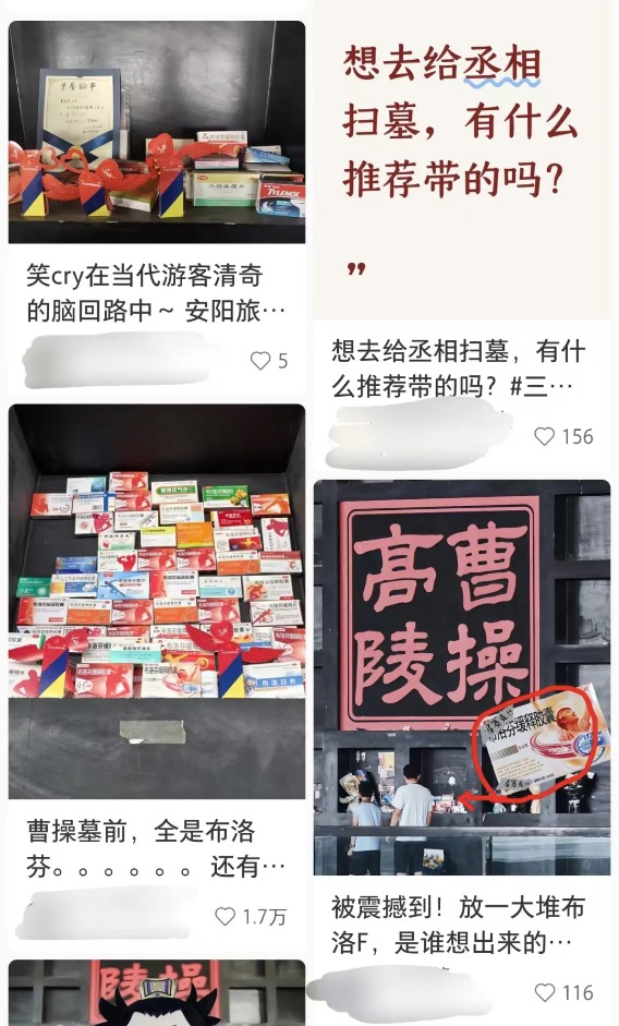 曹操高陵遗址博物馆2023年4月开馆之际,一位来自广州的三国迷在此放下了一盒布洛芬,从此大量游客开始给曹丞相“投喂”布洛芬。据小风描述,博物馆的供品柜所有游客身高能够着的隔间里,都被一盒盒布洛芬塞满了。