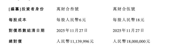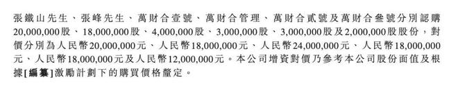 具体来看,2025年9月,张铁山以2000万元的价格认购公司2000万股;张峰以1800万元认购1800万股,对应每股价格仅1元。而由员工和创始人家族的亲友持股平台“万财合”,合计以7200万元认购了1200万股,平均6元/股。