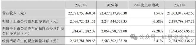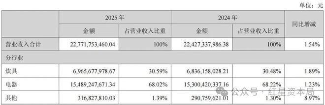 红星资本局4月4日消息,近日,小家电龙头苏泊尔(002032.SZ)发布2025年年度报告,公司全年实现营业收入约227.72亿元,同比增长1.54%;归属于上市公司股东的净利润约20.97亿元,同比下降6.58%;扣非归母净利润约19.14亿元,同比下降7.28%。
