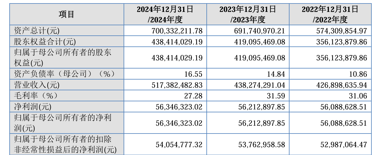 业绩方面,2022至2024年,吉和昌营业收入分别为4.27亿元、4.38亿元、5.17亿元,年化复合增速约10%;同期扣非净利润分别为5299万元、5376万元、5405万元,几乎“原地踏步”。