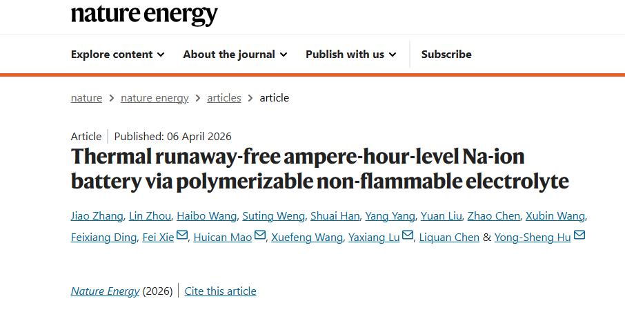 4月6日,中国科学院物理研究所胡勇胜团队在《自然·能源》发表重磅成果:该团队成功开发出一种具有自保护功能的可聚合不燃电解质(PNE),全球首次在安时级钠离子电池中实现彻底阻断热失控。