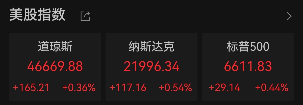 美东时间周一,美股三大指数集体上涨。截至收盘,道指涨幅为0.36%,报46669.88点;纳指涨幅为0.54%,报21996.34点;标普500指数涨幅为0.44%,报6611.83点。