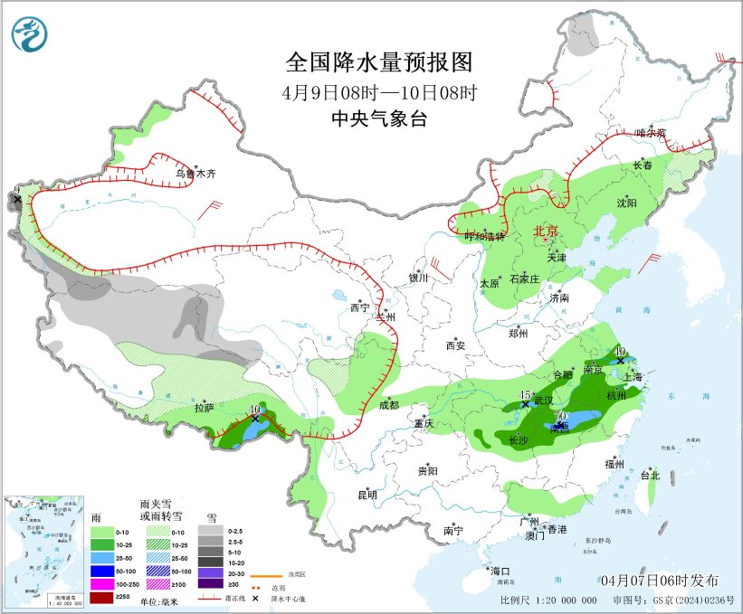 4月9日08时至10日08时,吉林东部、新疆南疆西部山区、西藏中北部、青海西南部、川西高原北部等地部分地区有小到中雪或雨夹雪,其中,新疆南疆西部山区等地部分地区有大雪(5~9毫米);西藏东南部、江苏南部、安徽南部、江南北部、湖北东部等地部分地区有中到大雨,其中,江西北部等地局地有暴雨(50~70毫米)。内蒙古西南部、新疆南疆盆地等地部分地区有5~6级风;黄海南部海域、东海大部海域将有6~7级风、阵风8级。