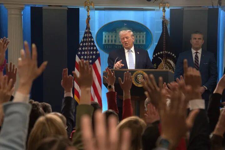 4月6日,美国总统特朗普在首都华盛顿白宫举行的新闻发布会上讲话。新华社发(李源清摄)