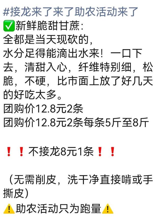 “我们楼下的商铺,8元一根,提前接龙团购价12.8元两根,从来没买到过这么便宜的甘蔗!”深圳市民陈女士介绍,她近期在楼下商铺的微信群看到甘蔗接龙信息,标注当天现砍,单根重5至8斤,属助农活动,只为跑量等。她当即团购了两根。