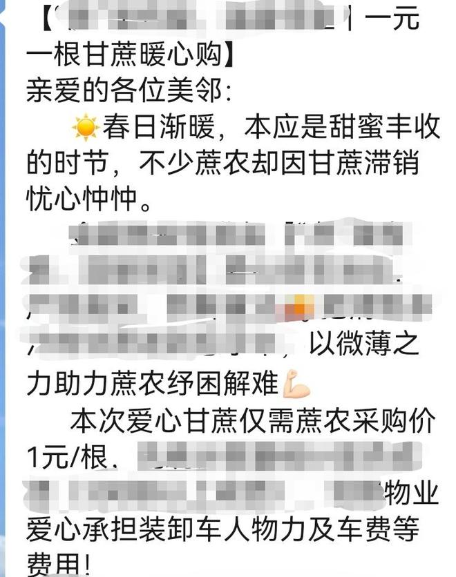 “是小区物业组织的接龙团购活动,一元一根,听说是他们自己去甘蔗地里现砍的。”深圳市民刘先生介绍,今年4月初,小区物业在群里发消息称,今年甘蔗因产量过大,不少农户面临滞销。为助农纾困,物业特发起甘蔗团购活动,仅收取1元/根的采购价,产地砍伐、运输等费用物业承担。消息发出后,小区内点赞、接龙的人络绎不绝,有人一次团购10根,仅刘先生所在的楼栋群,很快就接龙了两百多根。