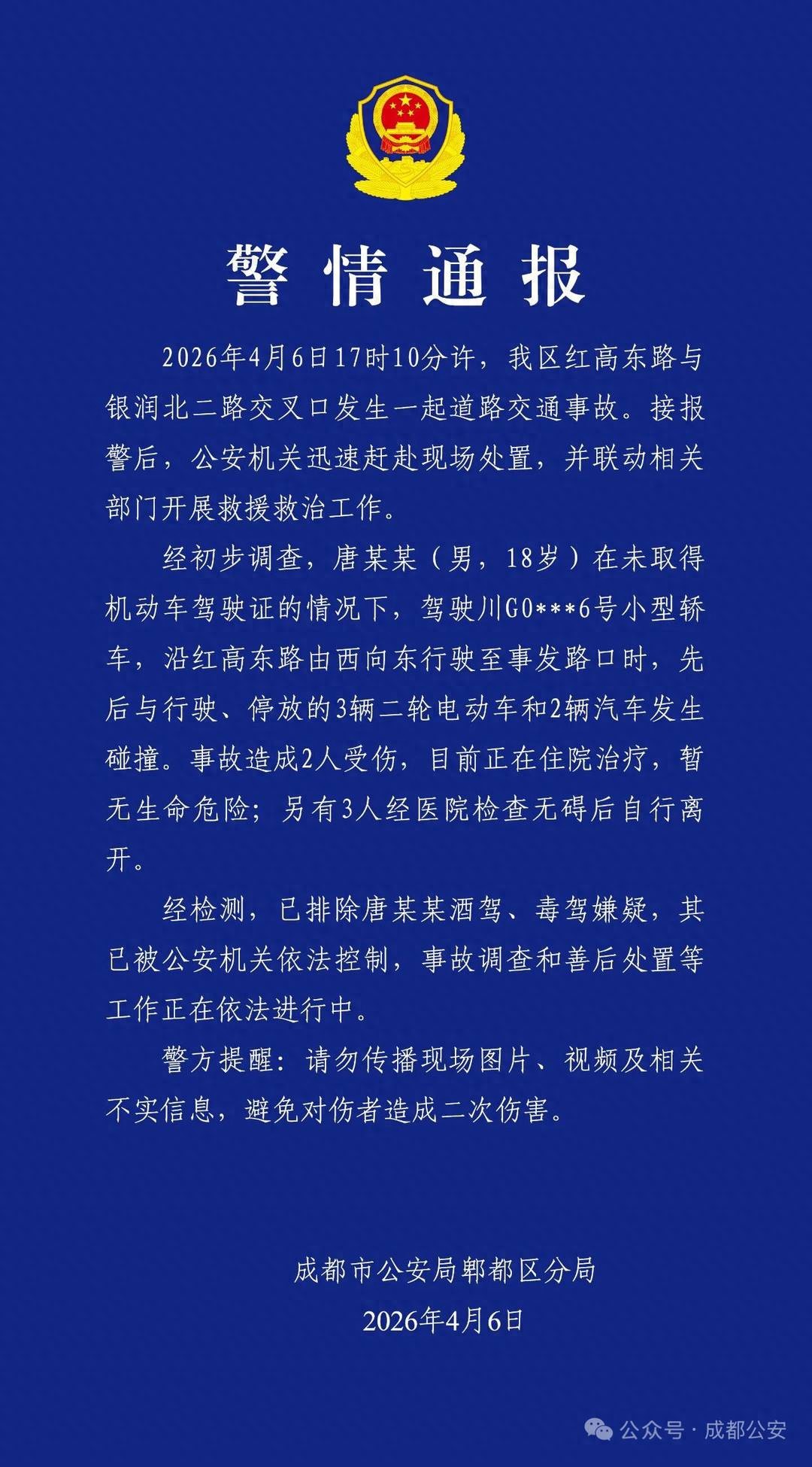 4月6日,成都市公安局郫都区分局发布警情通报称,2026年4月6日17时10分许,郫都区红高东路与银润北二路交叉口发生一起道路交通事故。接报警后,公安机关迅速赶赴现场处置,并联动相关部门开展救援救治工作。