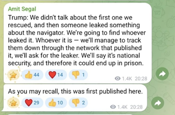 不过,一名以色列记者主动站出来,自认是率先报道此事的人。阿米特·西格尔(Amit Segal)7日在社交平台“电报”(Telegram)上先提及了特朗普要追查泄密者的威胁,然后承认他是首位报道美军士兵失踪消息的记者。