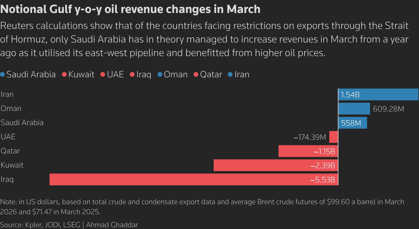 其中,沙特石油出口收入的“不降反增”无疑尤为引人注目——业内估算显示,在面临霍尔木兹海峡出口限制的国家(这里排除实际掌控海峡的伊朗和主要港口在海峡外的阿曼)中,理论上只有沙特阿拉伯在3月份实现了收入增长,因为油价上涨抵消了其出口量相对较小的降幅,甚至反而助推了收入的攀升。