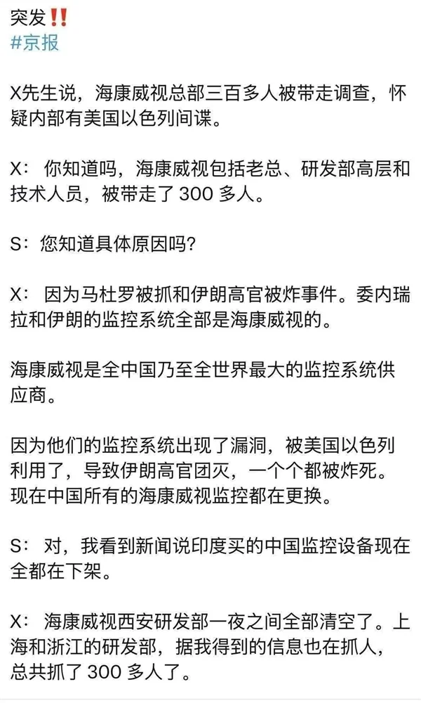 更令人难以置信的是,部分网络截图将海康威视与敏感的国际政治事件强行关联。谣言声称由于监控系统存在漏洞并被外部力量利用,导致了某些国际重要人物的行踪泄露(委内瑞拉马杜罗被带走、伊朗被炸等),这种说法显然极度离谱。