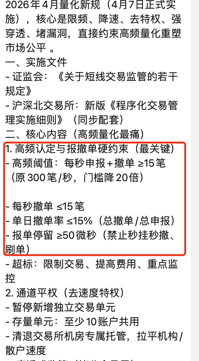 市场传言中,直接把短线交易新规以讹传讹成量化新规,该小作文表示“限频、降速、去特权、强穿透、堵漏洞,直接约束高频量化重塑市场公平。”其中,小作文指出,量化新规对高频认定从申报+撤单≥300笔/秒将至≥15笔/秒,门槛降低20倍。