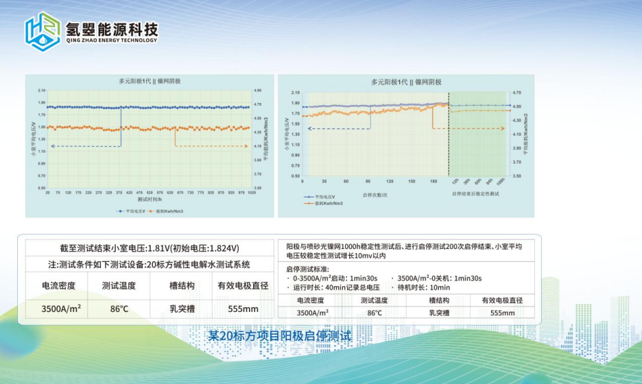展会现场,氢曌能源同步展示国标、行标及电解槽实测数据,涵盖电极活性、稳定性、耐腐蚀性等核心指标,形成“实验室测试—中试验证—工业应用”的全链条数据体系,充分体现企业严格的测试标准与技术自信。