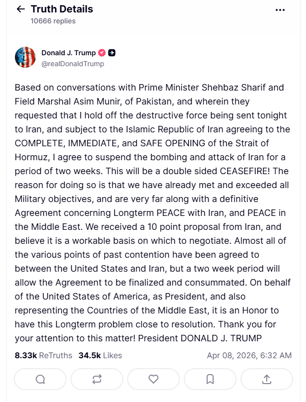 “这将是一项双向停火!这样做的原因是,我们已经完成并超额实现既定军事目标,并且在与伊朗达成长期和平协议以及中东和平协议方面取得了重大进展。”他写道。