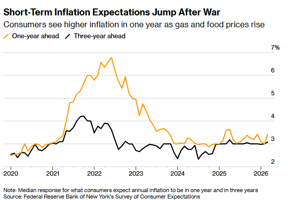 更令人不安的或许是通胀预期的同步走高。据纽约联储周二发布的一项调查显示,随着中东战争爆发,消费者预期汽油和食品价格将上涨,3月份的短期通胀预期出现一年来最大幅度的跃升。