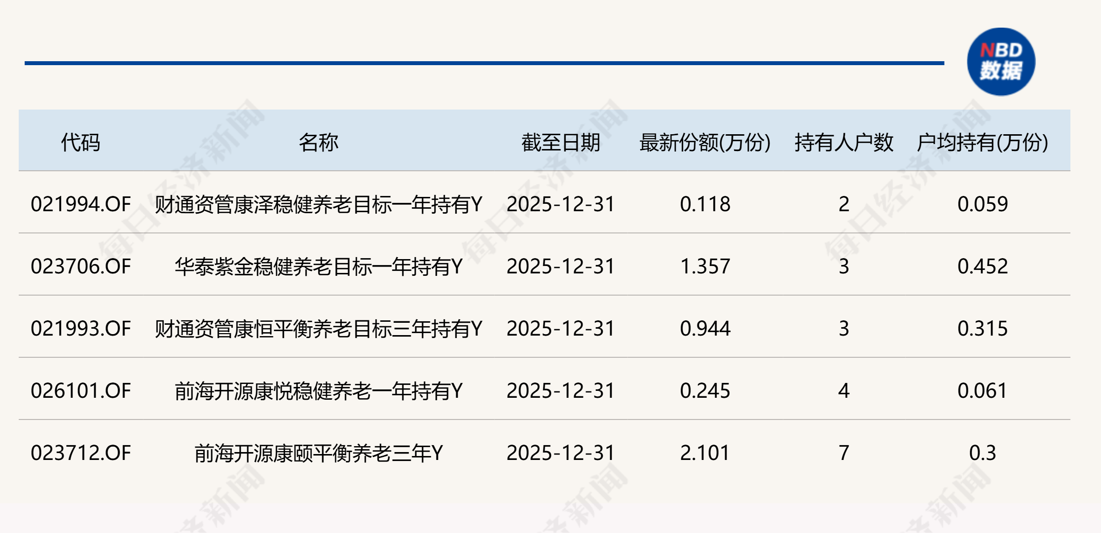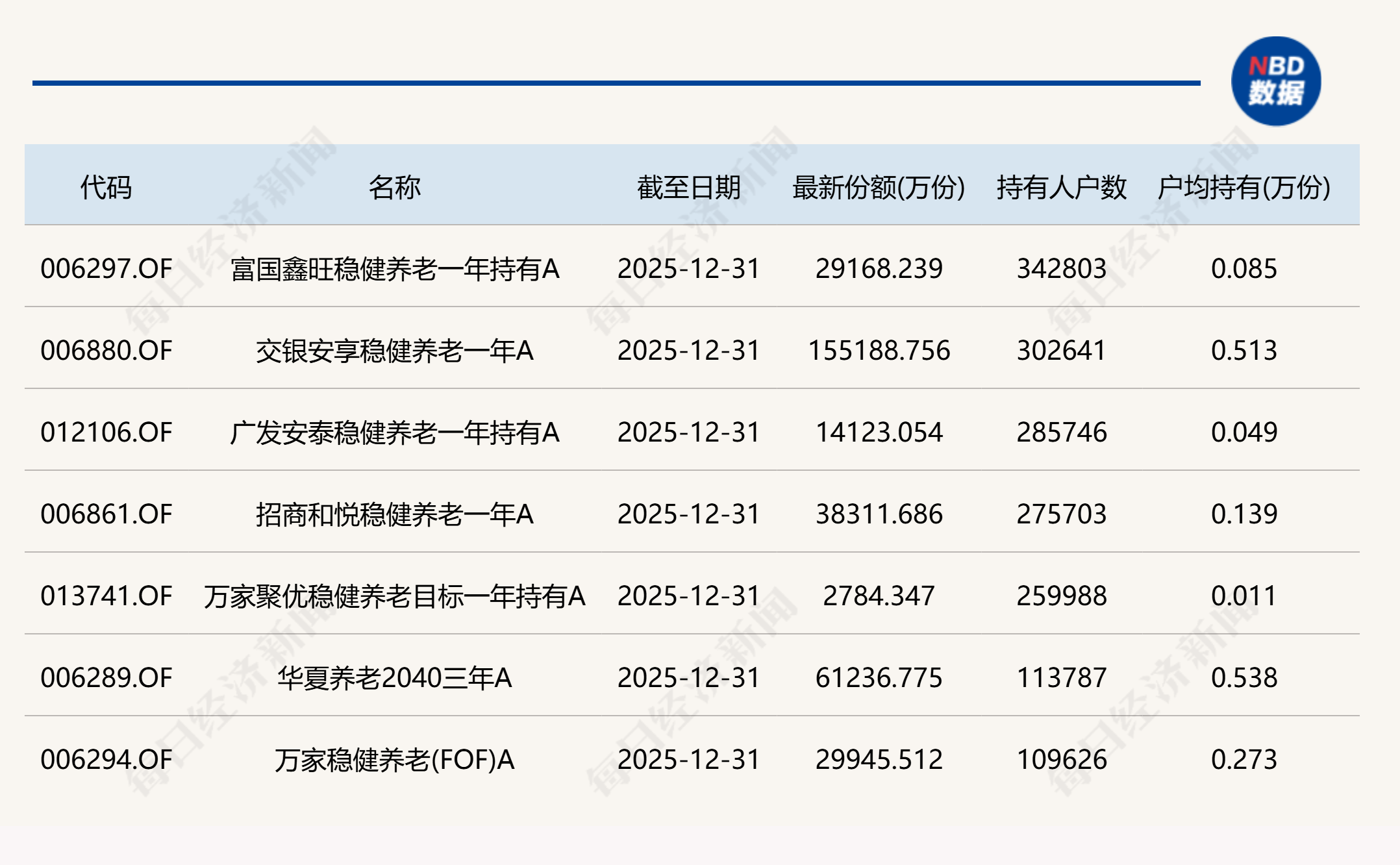 近期披露的养老目标基金2025年报显示,截至去年底,共有7只养老目标基金的持有人户数超过了10万户。其中富国鑫旺稳健养老一年持有A、交银安享稳健养老一年A的持有人户数更是超过了30万户。