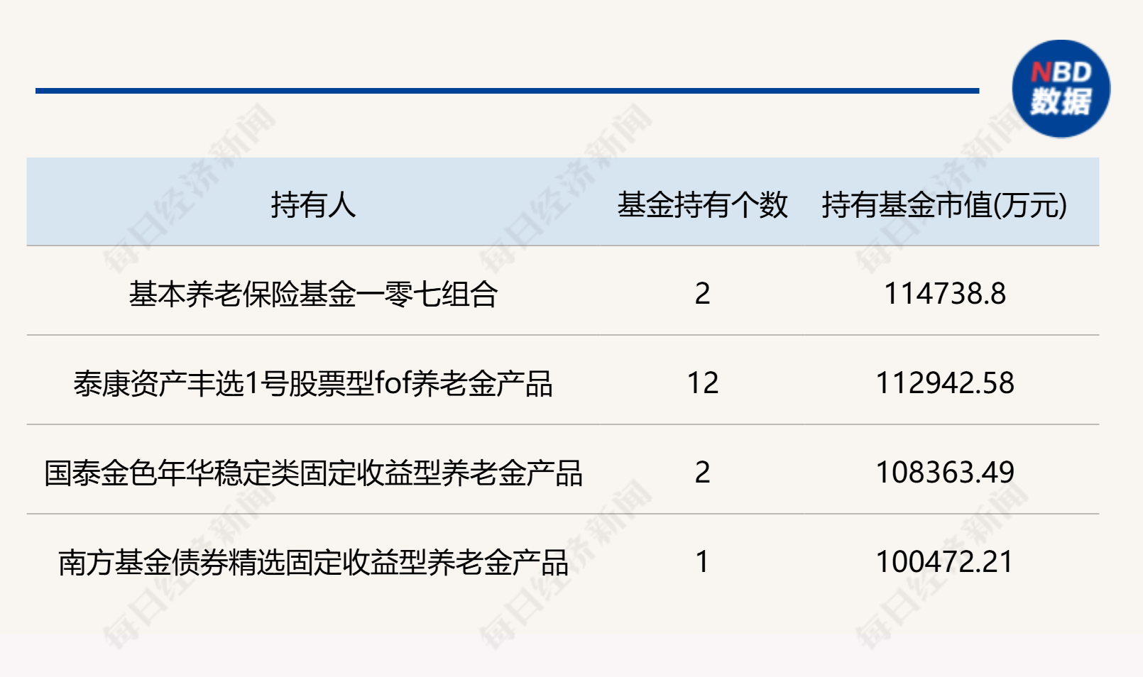 再看养老保险基金以及养老金产品持有上市基金的情况,数据显示,共有4个产品持有基金的市值超过10亿元。