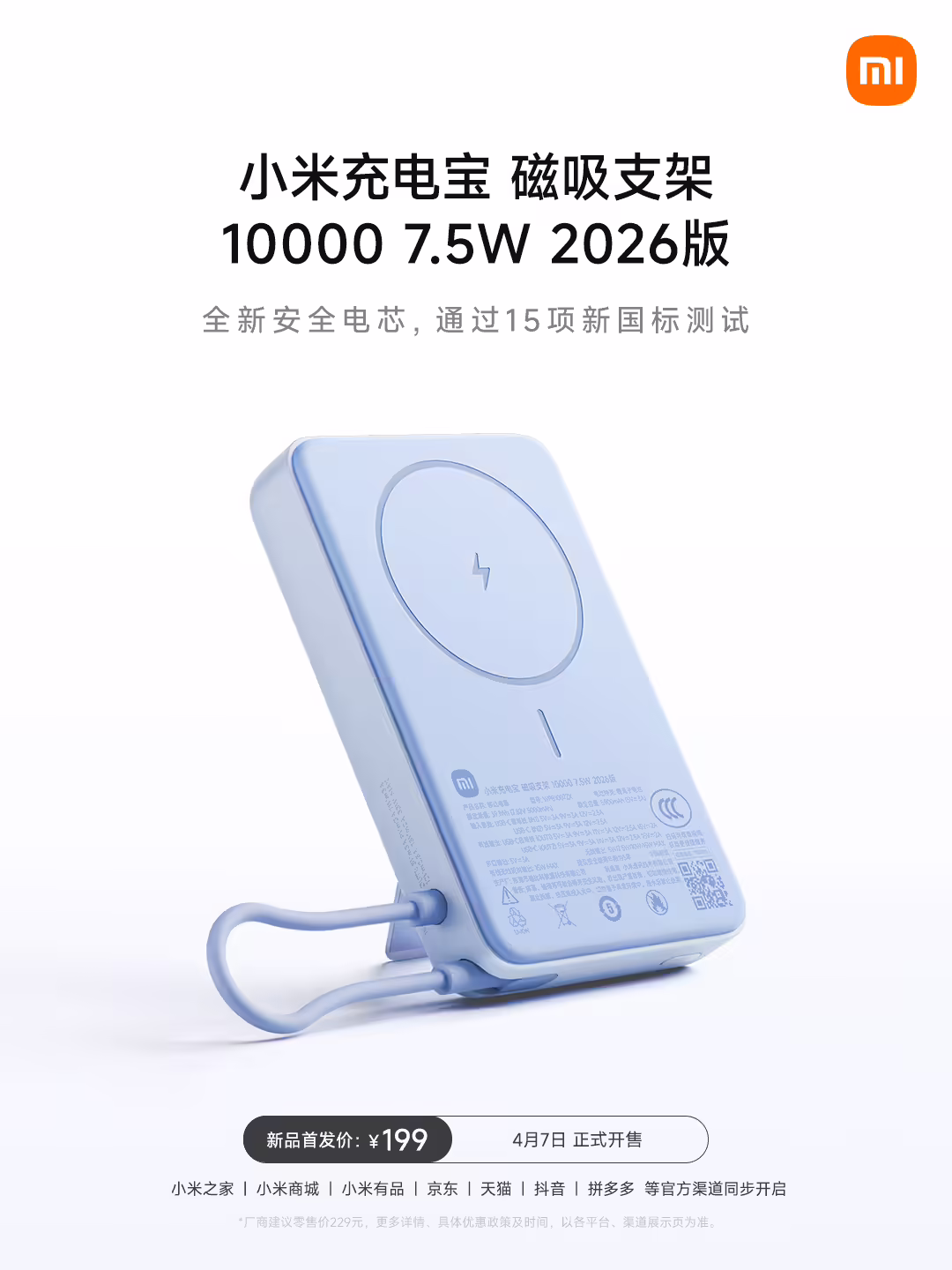 小米首款满足最新国标的充电宝今日正式发布,小米充电宝磁吸支架 10000 7.5W 2026 版现已开售,首发价 199 元。(点此购买)