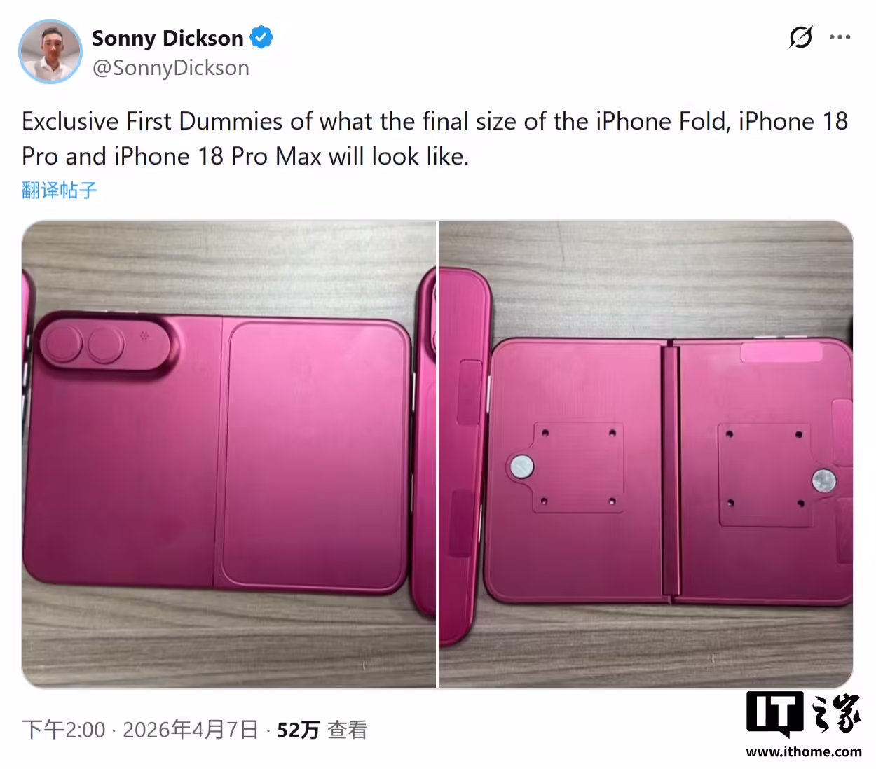 消息源 Sonny Dickson 和 Majin Bu 昨日(4 月 7 日)在 X 平台发布推文,分享了一组图片和一段视频,展示了苹果 iPhone 18 Pro、iPhone 18 Pro Max 及首款折叠 iPhone Fold 的机模。