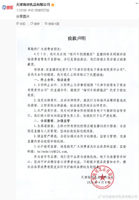 8日凌晨,微博@天津海河乳品有限公司 发布致歉声明称,4月7日,公司关注到“海河牛奶旗舰店”直播间相关视频内容给消费者带来不良影响,并引发舆论热议,深感自责并致以诚挚歉意。