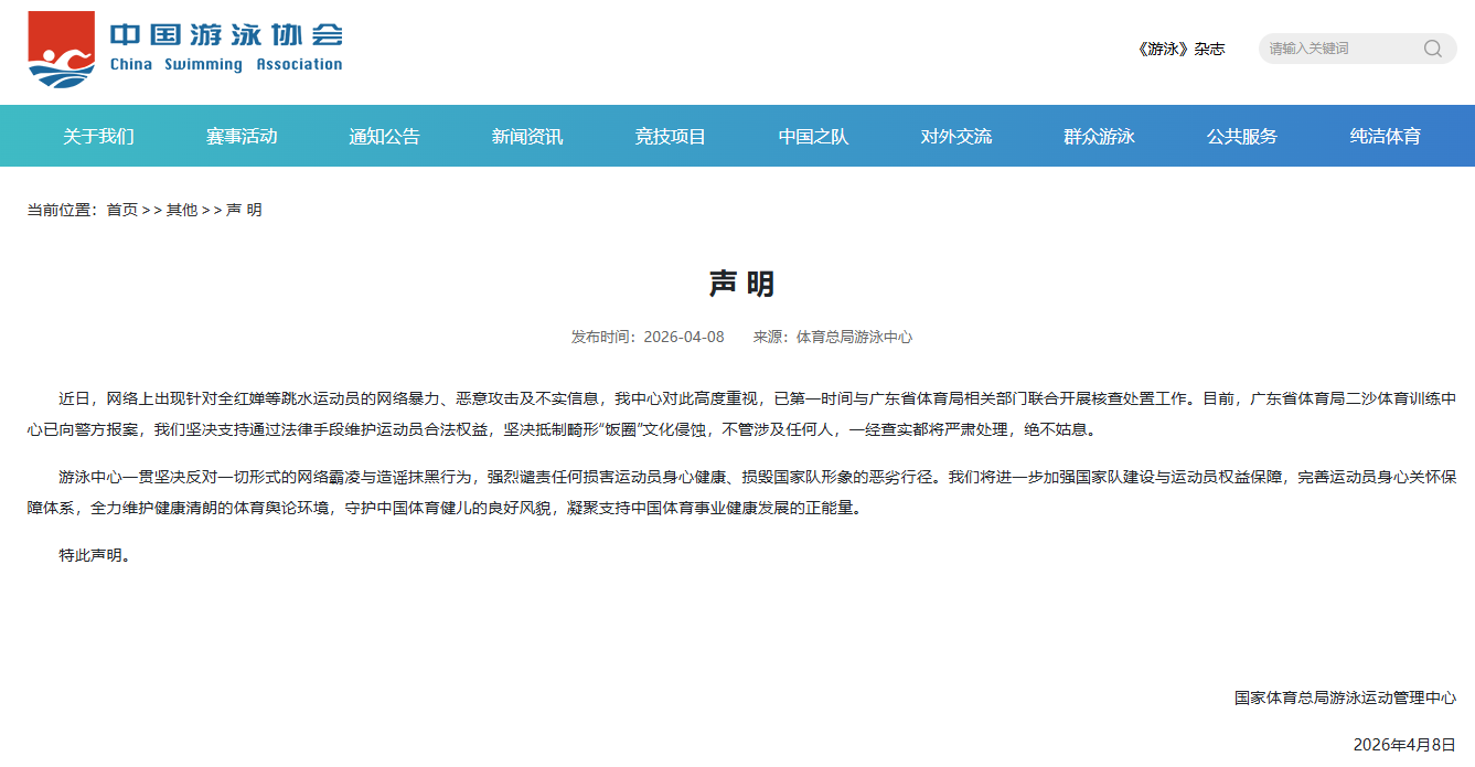 央视网消息:国家体育总局游泳中心就全红婵等跳水运动员遭受网暴一事发布声明。
